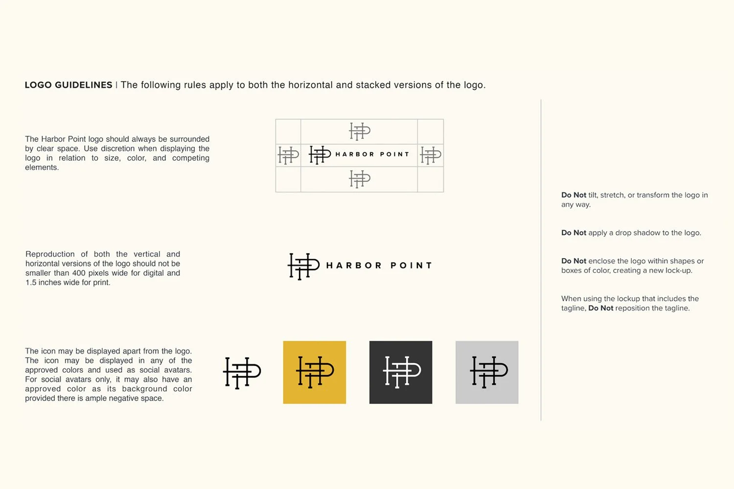 Harbor Point needed a cohesive visual identity that would elevate its presence across both physical and digital touchpoints. This comprehensive branding project included the design of a custom logo, visual identity system, brand style guide, and branded applications such as signage and apparel.