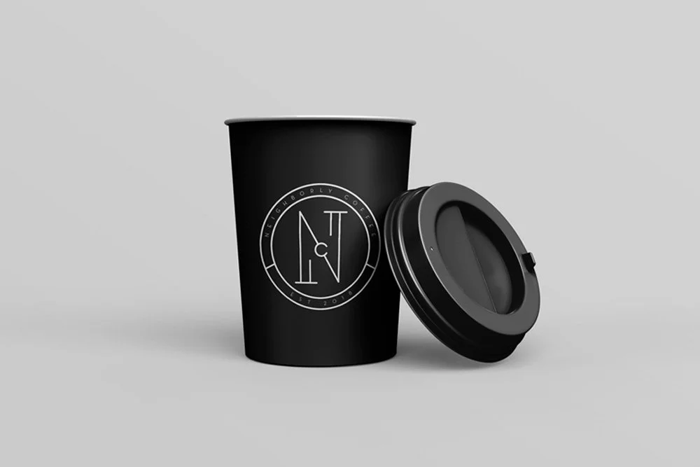 The paper cups reinforce the brand’s cohesive visual identity, featuring a prominent logo-centered design that ensures brand recognition with each use. The cups’ black and white palette contributes to a timeless, polished look that appeals to modern coffee drinkers while reflecting the sophistication of Neighborly Coffee. These cups create a consistent and memorable experience, aligning with the brand’s upscale yet inviting atmosphere.