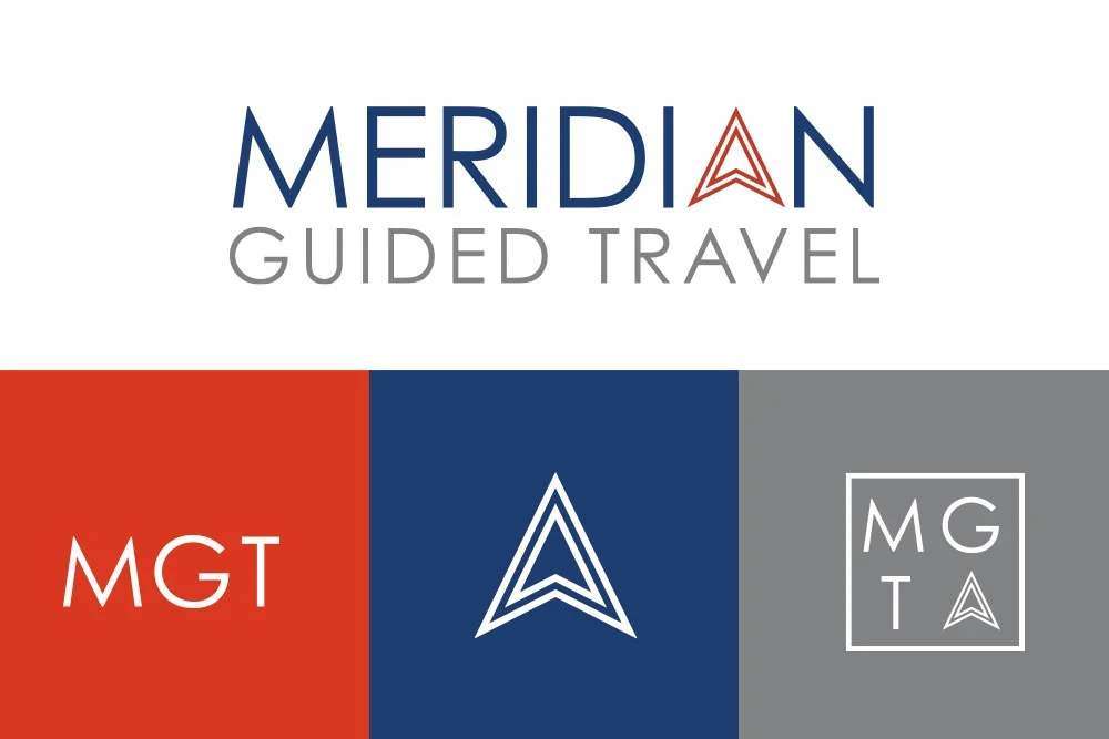 The logo for Meridian Guided Travel features a modern and sophisticated design, with a distinct arrow symbol that embodies direction and movement, aligning with the company’s mission to guide clients on unforgettable journeys. The color palette combines a bold red and deep navy, symbolizing passion and reliability, while the sleek, sans-serif typography maintains a clean and professional aesthetic. These elements come together to create a visual identity that resonates with Meridian’s adventurous yet refined brand ethos.