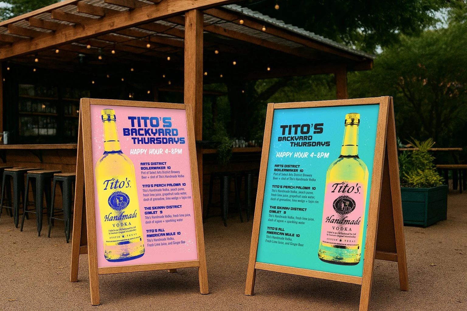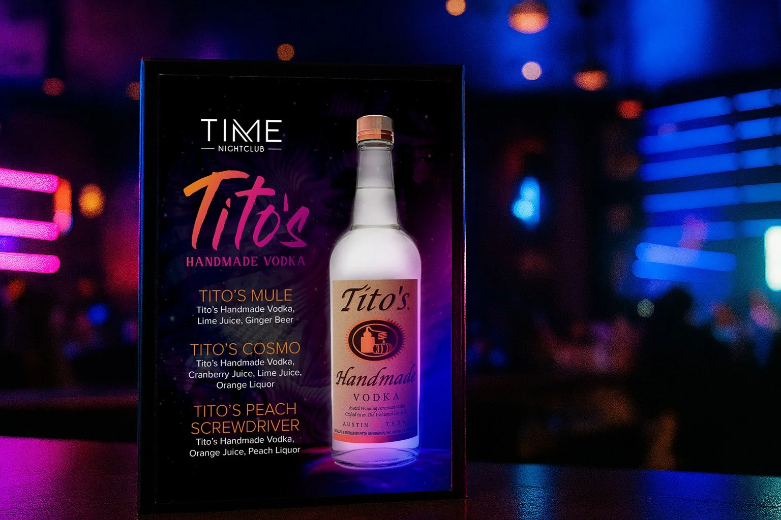 Designed exclusively for TIME Nightclub, this table tent was crafted to resonate with the high-energy nightlife crowd. The bold typography and electric colors reflect the vibrant club atmosphere, making Tito’s cocktails stand out among other drink options. The primary goal was to create a visually striking presentation that would entice club-goers to order Tito’s specialty drinks, thereby increasing brand visibility and boosting sales in a competitive environment.