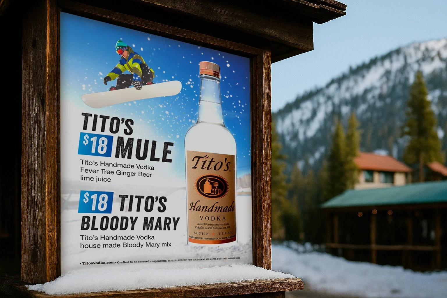 For Mammoth Mountain Resort, the objective was to design a poster that would align Tito’s with the adventurous, energetic spirit of a ski resort. This poster was tailored to capture the interest of resort visitors by visually integrating Tito’s with the cold, dynamic landscape of Mammoth Mountain. By positioning Tito’s as the perfect drink for relaxation after an exhilarating day on the slopes, the design sought to strengthen the brand’s appeal within the mountain resort atmosphere.