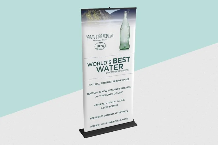 For conferences and trade shows, a retractable banner was developed to create a commanding presence while adhering to a clean and modern aesthetic. The banner features striking visuals of Waiwera Water set against a serene New Zealand backdrop, instantly attracting attention amidst the bustling event atmosphere. The design balances bold imagery with concise messaging, ensuring that viewers can quickly grasp the brand's core values of purity and exclusivity. The banner not only elevates the booth's visual appeal but also reinforces brand recognition, serving as a pivotal touchpoint in the overall marketing strategy.