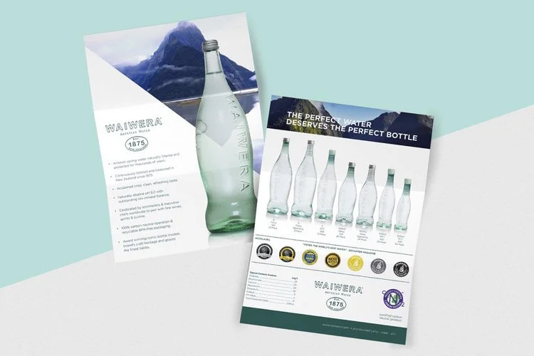 This project entailed creating a cohesive set of sales materials for Waiwera Water, an exclusive New Zealand water renowned for its unparalleled purity. Distributed solely by Young's Market, the objective was to encapsulate the essence of Waiwera Water through sophisticated and modern design. The materials needed to inform and impress, appealing to both discerning consumers and industry professionals by highlighting the water's pristine origins and esteemed accolades.